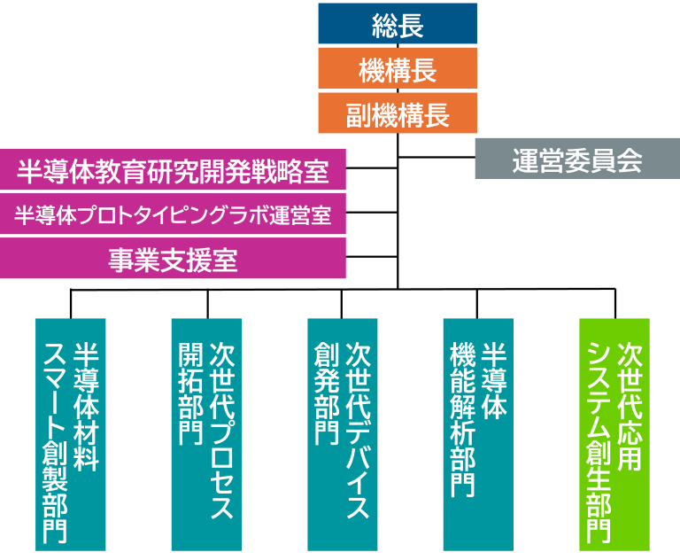 機構長の下、「半導体教育研究開発戦略室」、「半導体プロトタイピングラボ運営室」及び「事業支援室」並びに半導体の開発・利用に必要な要素ごとに統合する「半導体材料スマート創製部門」、「次世代プロセス開拓部門」、「次世代デバイス創発部門」、「半導体機能解析部門」、「次世代応用システム創生部門」を設置します。