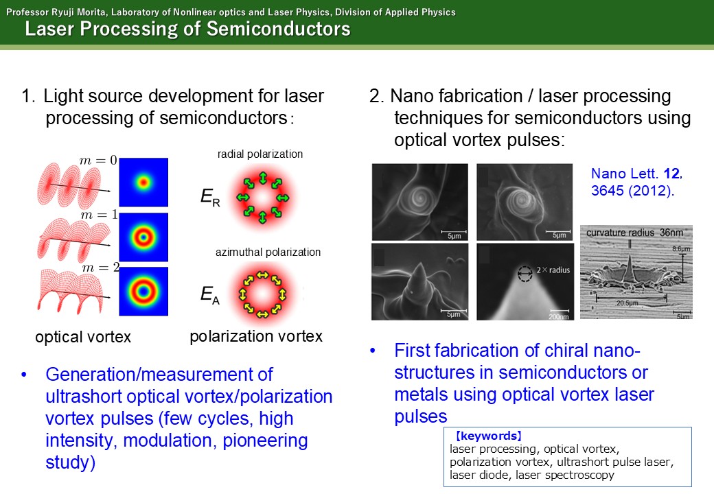 Researcher Archive Ryuji Morita Faculty of Engineering Professor Research Layer Device Keyword laser processsing optical vortex polarization vortex ultrashort pulse laser laser diode spectroscopy of semiconductor Back to the Researcher List