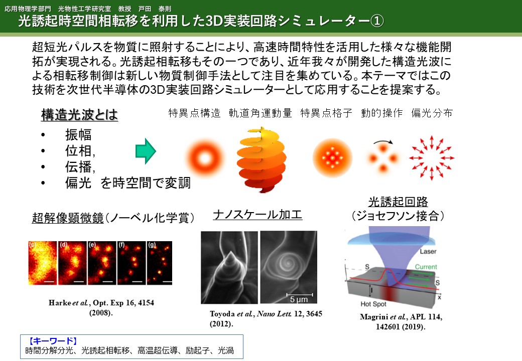 RESEARCHER 研究者一覧 戸田 泰則 Yasunori Toda 大学院工学研究院 教授 研究レイヤ 機能解析 研究キーワード 時間分解分光 光誘起相転移 高温超伝導 励起子 光渦 研究者一覧へ戻る